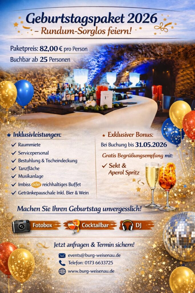 Feiern Sie Ihren Geburtstag in besonderem Ambiente auf Burg Weisenau. Perfekte Location für Geburtstage, Familienfeiern & Events in Mainz. Einzigartige Atmosphäre für unvergessliche Geburtstagsmomente. Jetzt Termin sichern und individuell planen lassen! Stilvoll feiern mit Freunden & Familie auf der Burg Weisenau.