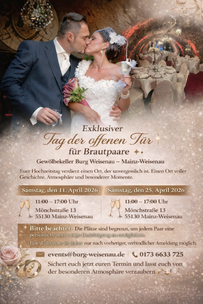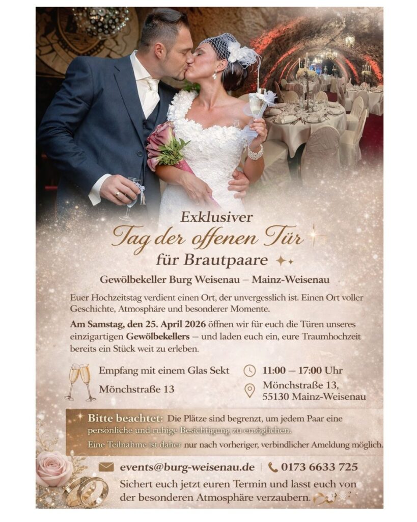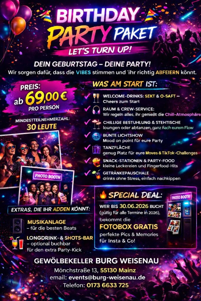 Ein Geburtstag ist ein besonderer Moment im Leben – ein Tag voller Freude, Lachen und schöner Erinnerungen. In der historischen Eventlocation Burg Weisenau in Mainz‑Weisenau wird jede Geburtstagsfeier zu einem unvergesslichen Erlebnis. Unser Gewölbekeller verbindet rustikalen Charme mit moderner Ausstattung und schafft eine einzigartige Atmosphäre für jeden Anlass.