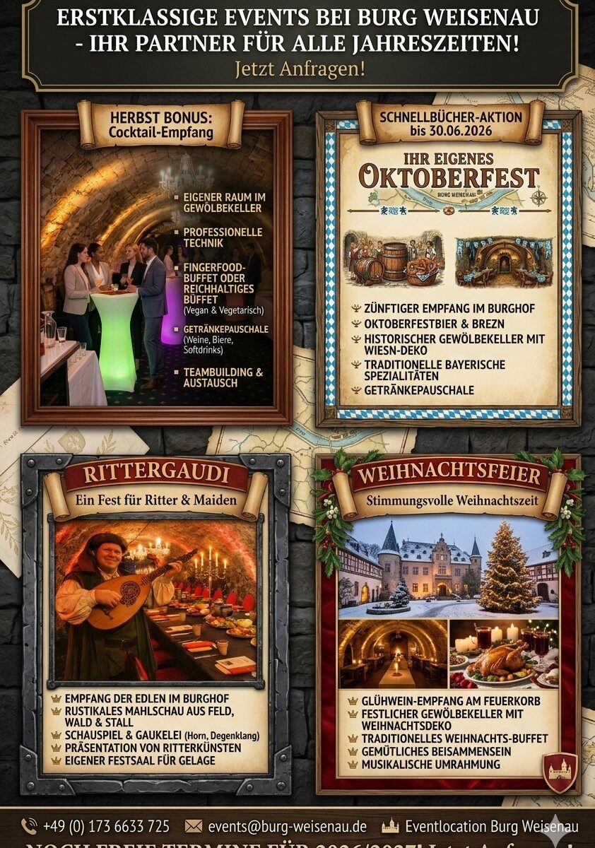 Vergessen Sie klassische Tagungsräume. Im Gewölbekeller der Burg Weisenau verwandeln wir Ihr Firmenevent in ein immersives Erlebnis. Unsere All-Inclusive-Erlebnisse sind speziell darauf ausgerichtet, Teams zu stärken, Kunden zu begeistern und Ihre Markenbotschaft in einem unvergleichlichen Ambiente zu verankern.